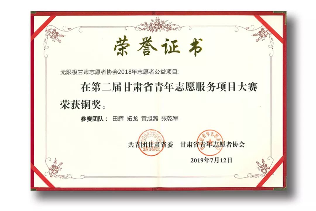 无限极甘肃志愿者协会历经1个多月的评审,经过抽签分组、路演汇报和专家评委答辩等层层选拔,从270个参评项目中脱颖而出,获得了由共青团甘肃省委、甘肃省青年志愿者协会共同授予的“甘肃省青年志愿者服务项目大赛铜奖”荣誉称号。