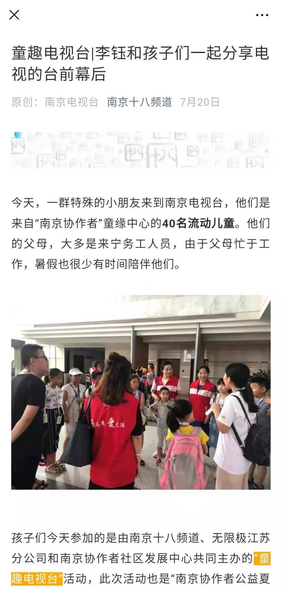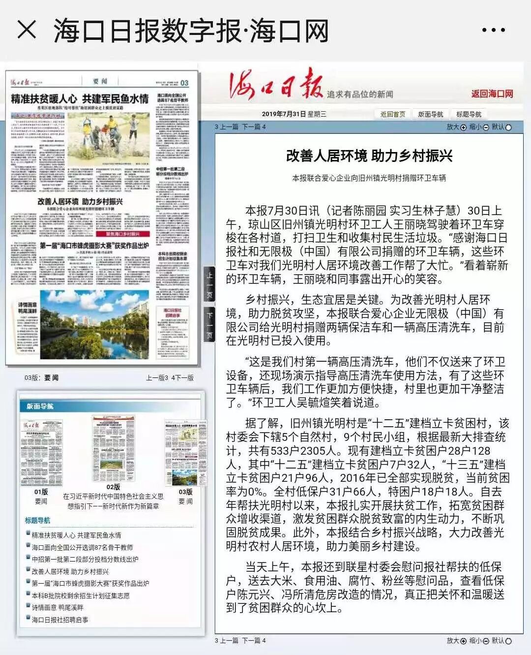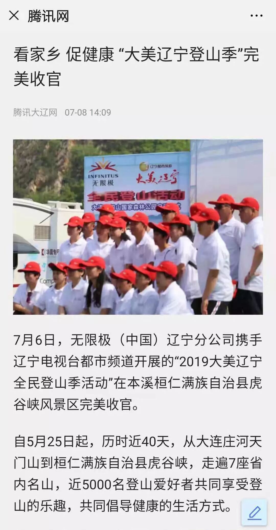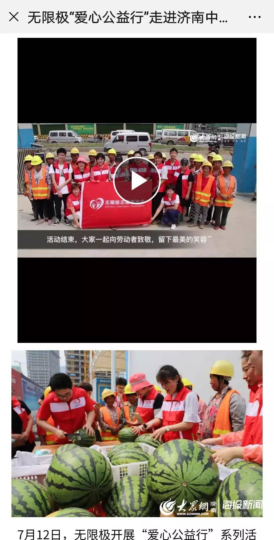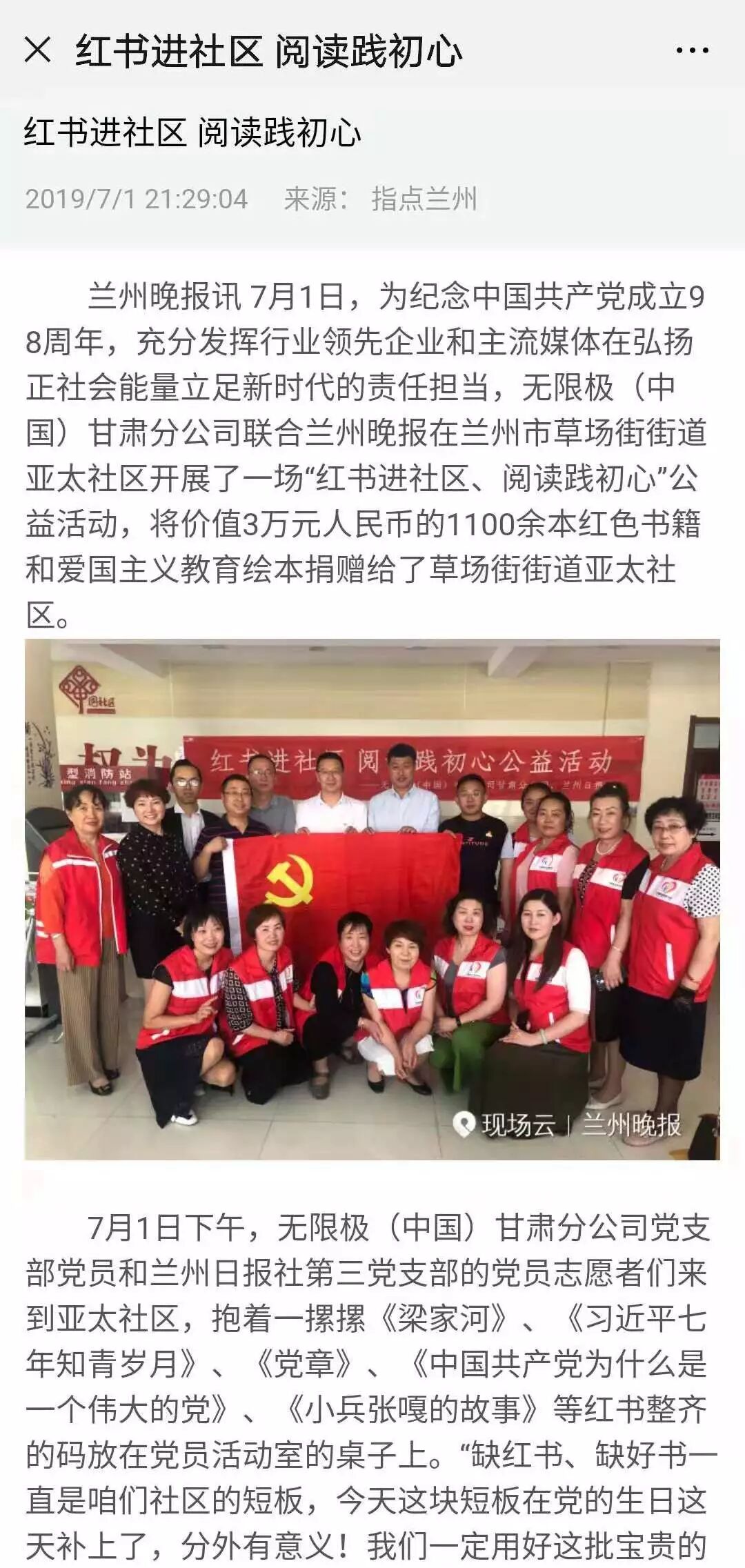 地点:甘肃省兰州市 活动:“红书进社区、阅读践初心”公益活动 合作媒体:兰州晚报 媒体报道截图 长按并识别上方二维码,即可查看原文报道 7月1日,为纪念中国共产党成立98周年,充分发挥企业和主流媒体在弘扬社会正能量的作用,无限极(中国)有限公司甘肃分公司联合兰州晚报在兰州市草场街街道亚太社区开展了一场“红书进社区、阅读践初心”公益活动,将价值3万元人民币的1100余本红色书籍和爱国主义教育绘本捐赠给了草场街街道亚太社区。 02时间:7月6日 地点:辽宁省大连市 活动:2019大美辽宁全民登山季活动 合作媒体:辽宁电视台都市频道 媒体报道截图 长按并识别上方二维码,即可查看原文报道 7月6日,无限极(中国)有限公司辽宁分公司携手辽宁电视台都市频道开展的“2019大美辽宁全民登山季活动”在本溪桓仁满族自治县虎谷峡风景区圆满收官。自5月25日起,历时近40天,从大连庄河天门山到桓仁满族自治县虎谷峡,走遍7座省内名山,近5000名登山爱好者共同享受登山的乐趣,共同倡导健康的生活方式。 03时间:7月12日 地点:山东省济南市 活动:“爱心公益行”系列活动暨走进济南中央商务区慰问农民工友活动 合作媒体:山东省互联网传媒集团 媒体报道截图 长按并识别上方二维码,即可查看原文报道 7月12日,由无限极(中国)有限公司山东分公司与山东省互联网传媒集团联合开展的,无限极“爱心公益行”系列活动暨走进济南中央商务区慰问农民工友活动,在济南中央商务区举行。无限极的爱心公益志愿者们将2000多斤西瓜运送至济南CBD建设现场,在炎炎夏日给农民工友们带来清凉,为“城市筑梦师”加油喝彩,也让公益更有力量。 04时间:7月14日 地点:福建省福州市 活动:2019“羽动榕城”城市联赛 合作媒体:海峡网 媒体报道截图 长按并识别上方二维码,即可查看原文报道 7月14日,由海峡网主办、福建嗨动体育承办、福州市羽毛球协会协办,无限极(中国)有限公司福建分公司支持的大型群众性体育赛事——2019“羽动榕城”城市联赛,在福州智园羽毛球馆圆满结束,十支参赛球队上演了精彩激烈的对决。这也是当地积极响应全民健身、推广健康生活方式的一次实践。 05时间:7月19日 地点:四川省 活动:第十五届四川质量论坛 合作媒体:消费质量报 7月19日,无限极(中国)有限公司四川分公司协办并参与了“第十五届四川质量论坛”,这是西南地区兼具影响力、权威性的专业论坛。来自政、商、学界的精英们紧紧围绕“深入实施质量强省战略 提升四川质量品牌竞争力和影响力”主题,交流倾听、演讲思考、对话质量,寻求质量共赢之道,共建品质四川。 06时间:7月20日 地点:江苏省南京市 活动:“童趣电视台”活动 合作媒体:南京十八频道 媒体报道截图 长按并识别上方二维码,即可查看原文报道 7月20日,由南京十八频道、无限极(中国)有限公司江苏分公司和南京协作者社区发展中心共同主办的“童趣电视台”活动在南京电视台举办。一群来自“南京协作者”童缘中心的40名流动儿童,走进南京电视台,跟着电视台主播一起探寻台前幕后的趣事。来自无限极的10名志愿者,全程陪同孩子们参观、就餐,并且为他们送上精美的文具。 07时间:7月30日 地点:黑龙江省哈尔滨市 活动:“无限”希望救助川崎病公益行动 合作媒体:生活报社 媒体报道截图 长按并识别上方二维码,即可查看原文报道 7月30日上午,哈尔滨市儿童医院与黑龙江省青少年发展基金会、生活报社、无限极(中国)有限公司黑龙江分公司联合启动“无限”希望救助川崎病项目,通过捐赠救助、国家支持及合作医院减免费用等形成的爱心链条,一同携手帮助川贫困川崎病患儿。 08时间:7月30日 地点:海南省海口市 活动:捐赠环卫车辆公益活动 合作媒体:海口日报 媒体报道截图 长按并识别上方二维码,即可查看原文报道 7月30日,海口日报联合无限极(中国)有限公司海南分公司向琼山区旧州镇光明村捐赠两辆保洁车和一辆高压清洗车,帮助当地居民改善人居环境,助力乡村振兴。目前,这些环卫车已在光明村投入使用。 接下来,无限极将继续与全国各地媒体合作,开展公益、健康类活动,小i也将会为大家带来更多精彩报道,敬请期待!