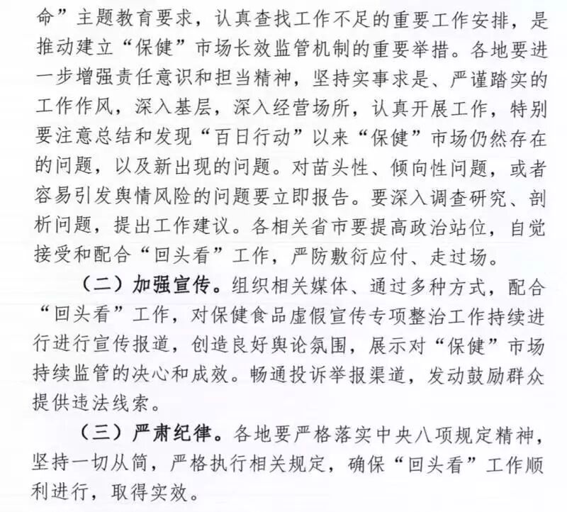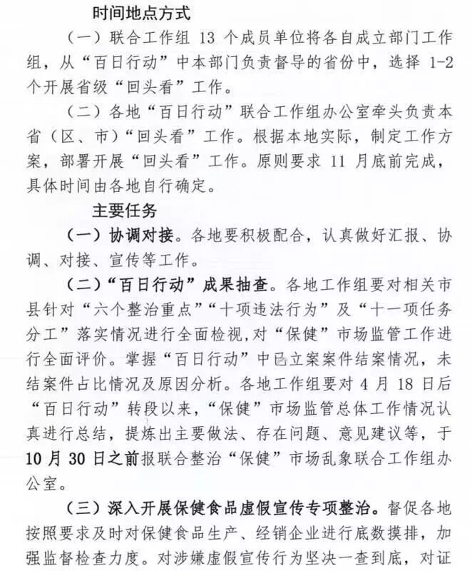 《通知》指出,工作组将从“百日行动”各成员单位负责督导的省份中选择1个至2个开展省级“回头看”工作,对各地落实“百日行动”部署的“六个整治重点”“十项违法行为”及“十一项任务分工”情况进行全面检视,通过案件督查、实地走访、收集意见等方式,了解各地“保健”市场监管工作总体情况、“保健”市场现状、长效监管机制建立及目前存在问题。