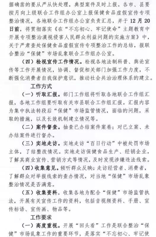 为深入贯彻落实《联合整治“保健”市场乱象百日行动方案》《在“不忘初心、牢记使命”主题教育中开展专项整治漠视侵害人民群众利益问题的实施方案》的要求,“百日行动”联合工作组办公室下发《关于开展联合整治“保健”市场乱象百日行动“回头看”工作的通知》,要求各地结合“不忘初心、牢记使命”主题教育学习,提高政治站位,推动建立“保健”市场长效监管机制。