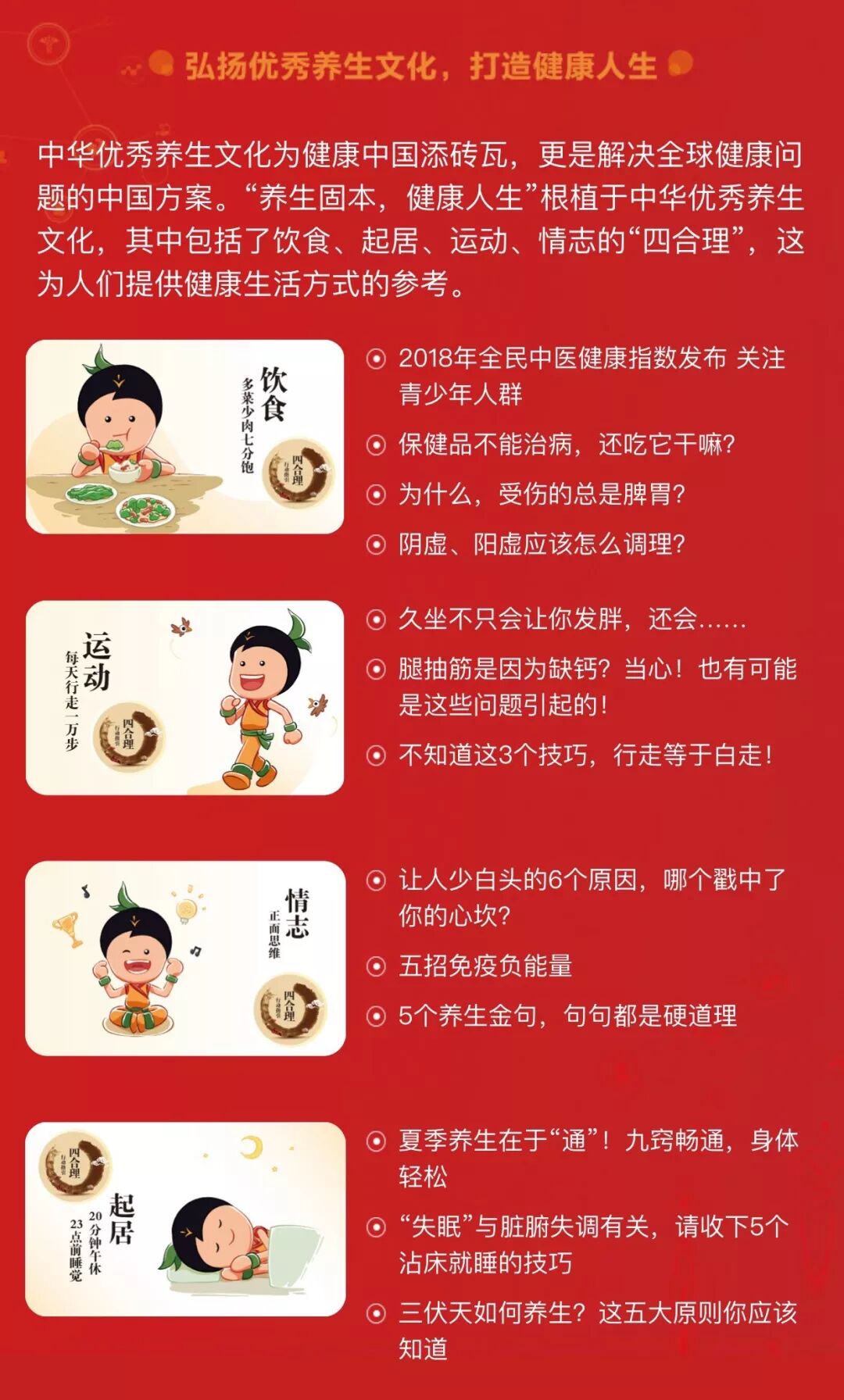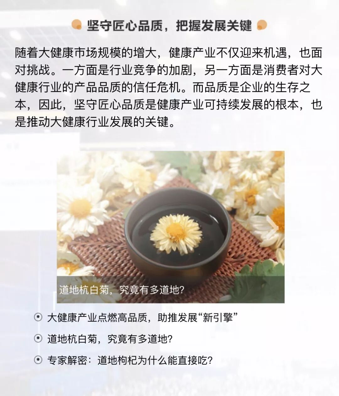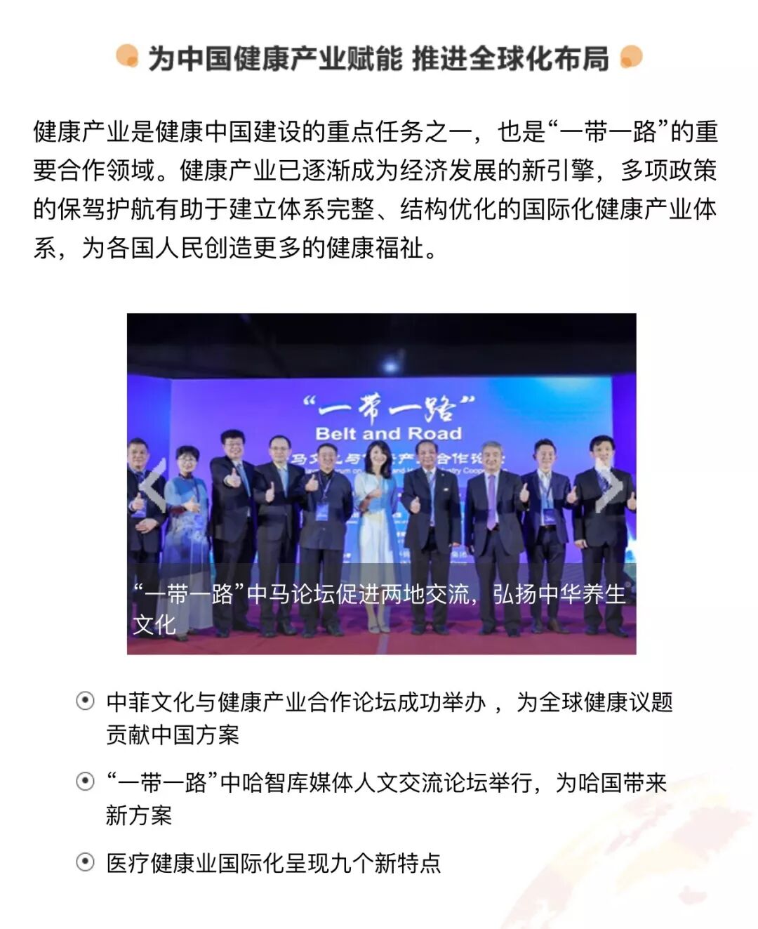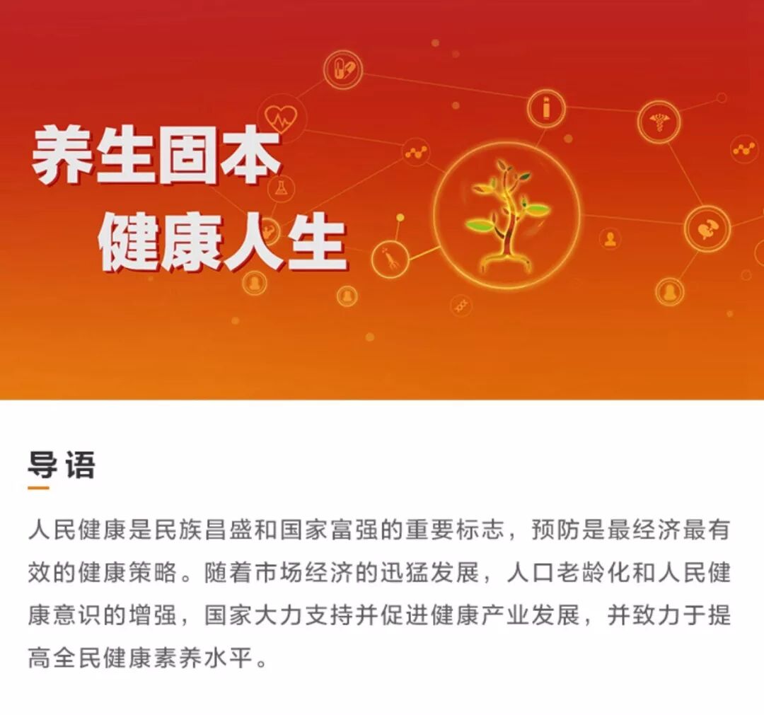 7月15日,国务院印发《国务院关于实施健康中国行动的意见》。《意见》指出,人民健康是民族昌盛和国家富强的重要标志,预防是最经济最有效的健康策略。《意见》还提出,要加快推动以治病为中心转变为以人民健康为中心。 随着市场经济的迅猛发展,人口老龄化和人民健康意识的增强,国家大力支持并促进健康产业发展,并致力于提高全民健康素养水平。 以此为契机,无限极和新浪财经频道联手打造了以“养生固本 健康人生”为主题的专题,为大众消费者提供科学、权威的科普信息内容和相关资讯。 专题内容主要包含建设健康中国、坚守匠心品质、弘扬优秀养生文化和健康产业全球布局四大版块,助力健康中国建设。 在建设健康中国版块,大家可以查询到“健康中国行动”“大健康产业发展趋势”等一系列国家政策、利好消息。 在坚守匠心品质版块,大家可以了解关于中国的健康企业在产品品质和道地中草药方面坚守匠心的相关信息。 弘扬优秀养生文化版块,讲述了“养生固本 健康人生”的健康理念,通过饮食、起居、运动、情志的“四合理”,为人们提供健康生活方式的参考。 健康产业全球化布局版块,大家可以了解中国健康产业的全球化发展进程和趋势。