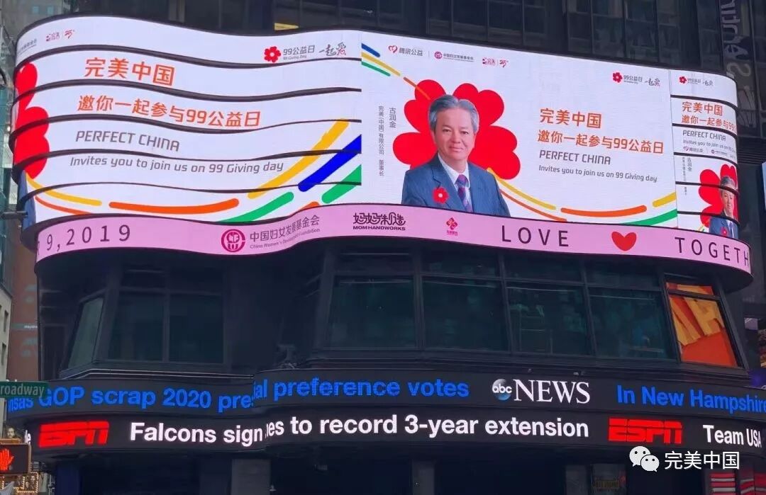 9月7日-9日 完美(中国)有限公司配捐300万元 联合中国妇女发展基金会、腾讯公益 带动广大网友积极参与线上公益 支持中国女性事业 为公益打Call! 公司连年参与“99公益日”企业配捐活动,支持妇基会在腾讯公益上线的上百个项目,包括“母亲邮包”“妈妈制造”“母亲水窖”等重点项目。 同时, 99公益日项目再次进入国际视野, 在有着“世界十字路口”之称的 纽约时代广场上, 公益广告画面 “完美中国,邀你一起参与99公益日” 十分亮眼。 画面展现了由中国妇女发展基金会、腾讯公益、完美公司一起推出的女性公益项目,让世界听见爱的声音! 完美99公益日公益广告画面还出现在北京地铁、深圳地铁等公共场所,不遗余力做公益的传播者。 99公益日,为线上线下的数亿网友提供了多元化的公益参与场景,引发新生态下的全民参与热潮。如今人人可公益,从“指尖公益”到“理性公益”,公益成为了一种生活态度和方式。 温暖新纪录 “涓涓细水,汇成公益的大海。” 99公益日,让源源不断的慈善热情汇聚成巨大的公益力量。 完美公司积极参与其中,与社会各界一起做好事,不断刷新温暖的新纪录。