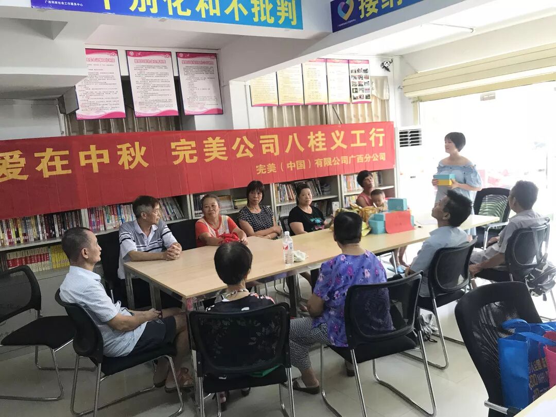 爱是责任,爱是力量,爱是精神。完美公司传承着公益中华,四海同心的博爱精神。在八桂义工协会的引导下,完美广西分公司向小区空巢老人捐赠了月饼及豆浆,召集员工、经销商为老人们整理家务,打扫卫生。大家与独居老人们齐聚谈心,分享他们的生活乐趣,了解他们的生活状况、健康状况等等。活动现场的老人们非常开心,纷纷表示感谢。
