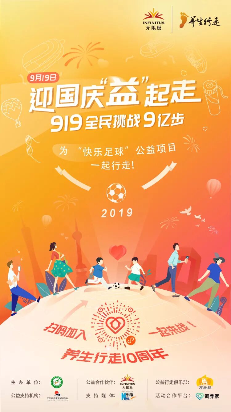 9月19日,无限极“9·19养生行走日”将发起“迎国庆‘益’起走 9·19全民挑战9亿步”线上公益行走活动,呼吁公众一起走起来,在收获健康的同时,还可以奉献爱心助力公益,并一起为新中国成立70周年献上祝福。 此次活动由中华中医药学会主办,无限极(中国)有限公司为公益合作伙伴,中国青少年发展基金会为公益支持单位,活动还得到“万步荟”公益行走俱乐部、调养家App的支持。 每年9月19日,是无限极专属的养生行走活动日。活动通过倡导10000步的养生行走,让大众树立健康的生活习惯,培养行走的健康意识,并传递无限极“养生固本 健康人生”独特的健康理念及“四合理”的养生方法,同时将活动与公益结合,进行步数的公益配捐(行走的每一步,无限极联合万步荟都将捐出对应的善款),让行走更有意义! 值得一提的是,2019年是无限极养生行走系列活动举办10周年的日子。从2010年开始,该系列行走活动已在北京、广州、上海、杭州等60多个城市,累计举办188场,直接参与市民超125万人,累计行走总里程突破600万公里,活动创下“累计举办场次最多的徒步行走活动”大世界基尼斯纪录。 今年发起的“迎国庆‘益’起走 9·19全民挑战9亿步” 线上公益行走活动,将采用全新的互联网玩法,参与者可以通过进入活动小程序,打卡完成10000步养生行走挑战的同时,还能收获三个“福利”。 你行走的每一步,无限极联合万步荟都将捐出对应的善款,给予中国青少年发展基金会,用于“希望工程·无限极快乐足球”公益项目。 只要你在活动小程序中上传步数,完成10000步挑战目标,即可获得一次抽奖机会。当活动达成9亿步的挑战目标,所有参与者都可以额外获得一次抽奖机会!10000份丰厚的奖品等你来拿哦! 除了做公益和拿大奖,你还可以通过活动培养万步养生行走的好习惯,收获行走带来的健康生活。
