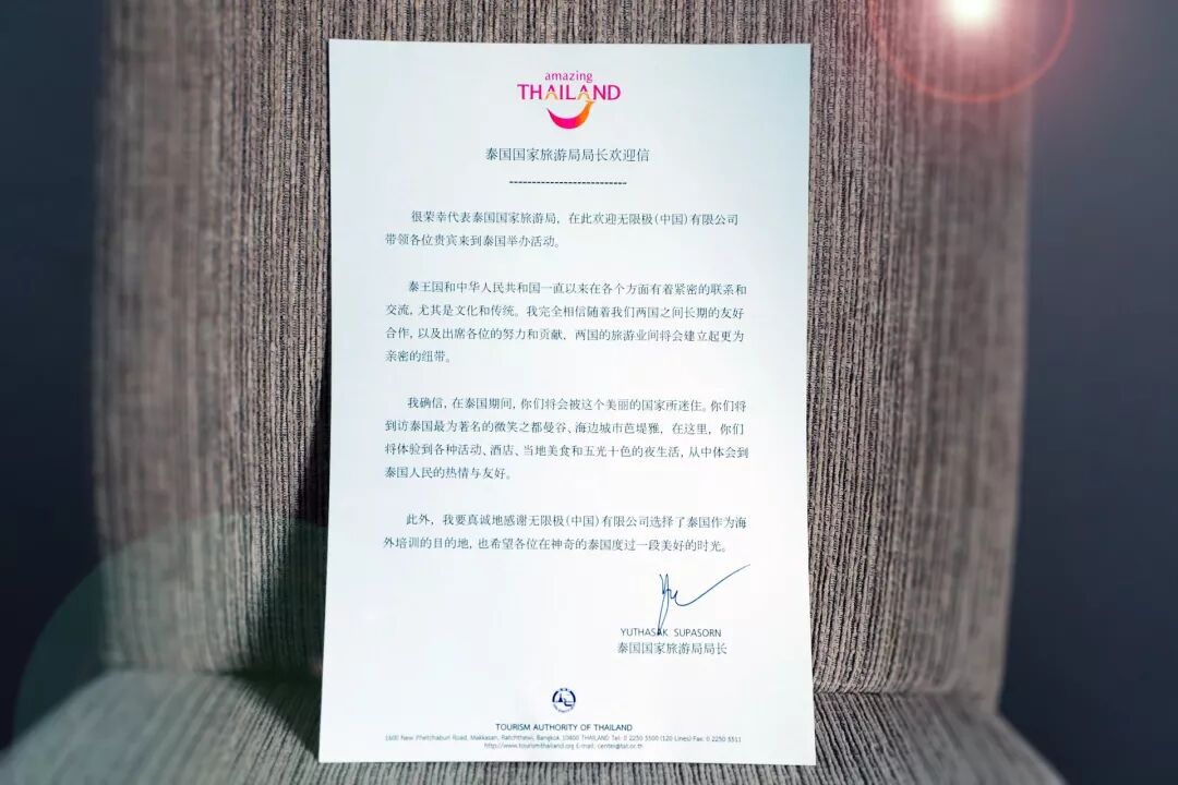 在下榻的曼谷酒店,伙伴发现了另一个惊喜——一封泰国国家旅游局局长的欢迎信,欢迎无限极伙伴来到泰国参加海外培训。