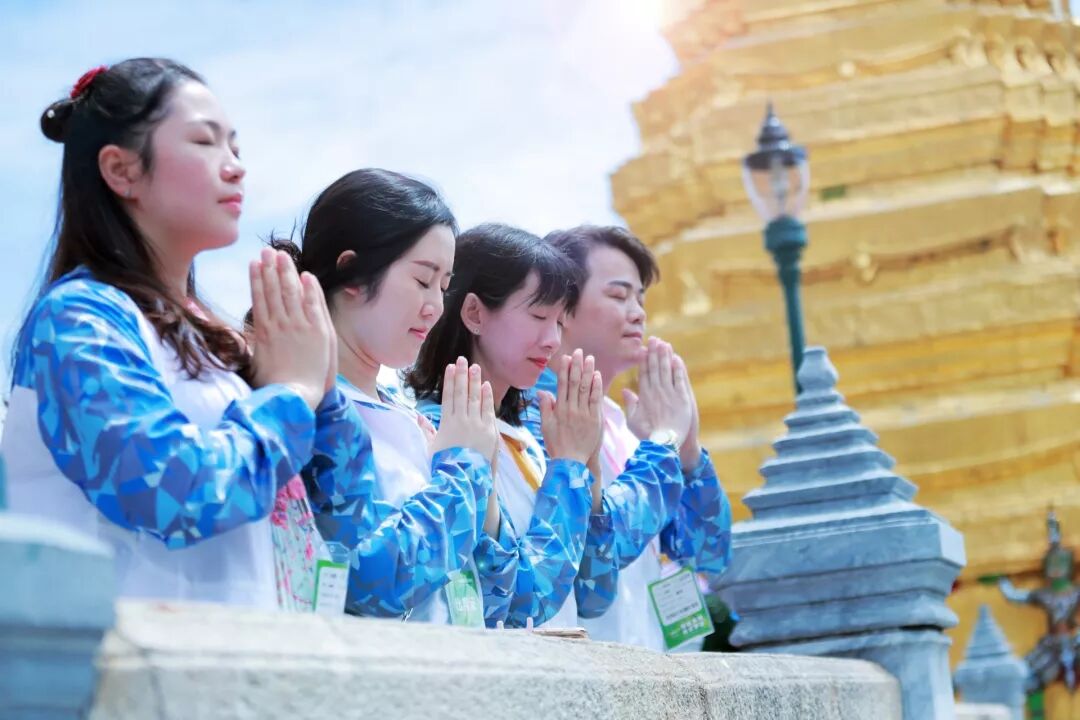 置身于玉佛寺宏伟的佛教建筑前,许多伙伴都忍不住双手合一,默默许下对生活、事业的美好愿望。