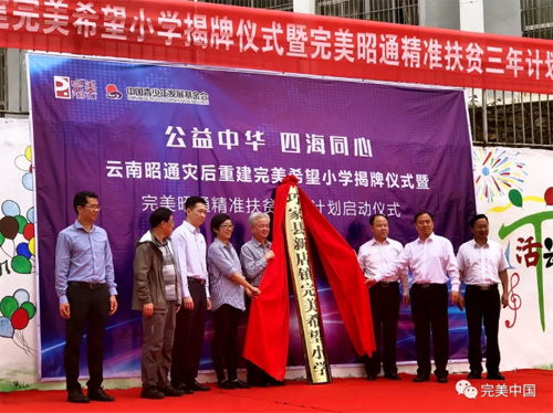 2018年9月13日,由完美公司捐建的新店镇渭姑完美希望小学、新店完美希望小学正式揭牌。同时,完美公司捐款300万元,携手中国青少年发展青基会、广东第六扶贫工作组发起“完美昭通精准扶贫三年计划”。这项计划也是全面贯彻落实中共中央国务院坚决打赢脱贫攻坚战的战略部署,履行企业社会责任的具体体现。