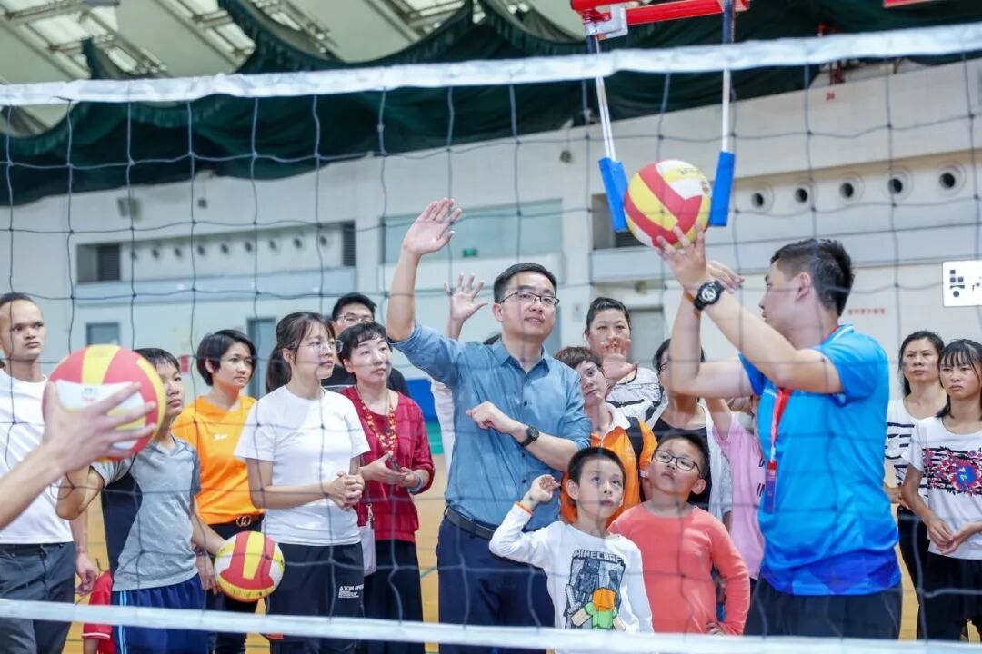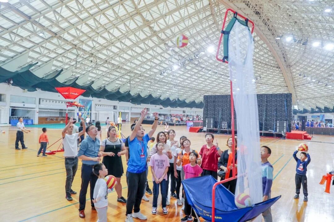 赛场上健儿们热情高涨,观众席上的观众也对体验排球这项运动跃跃欲试。