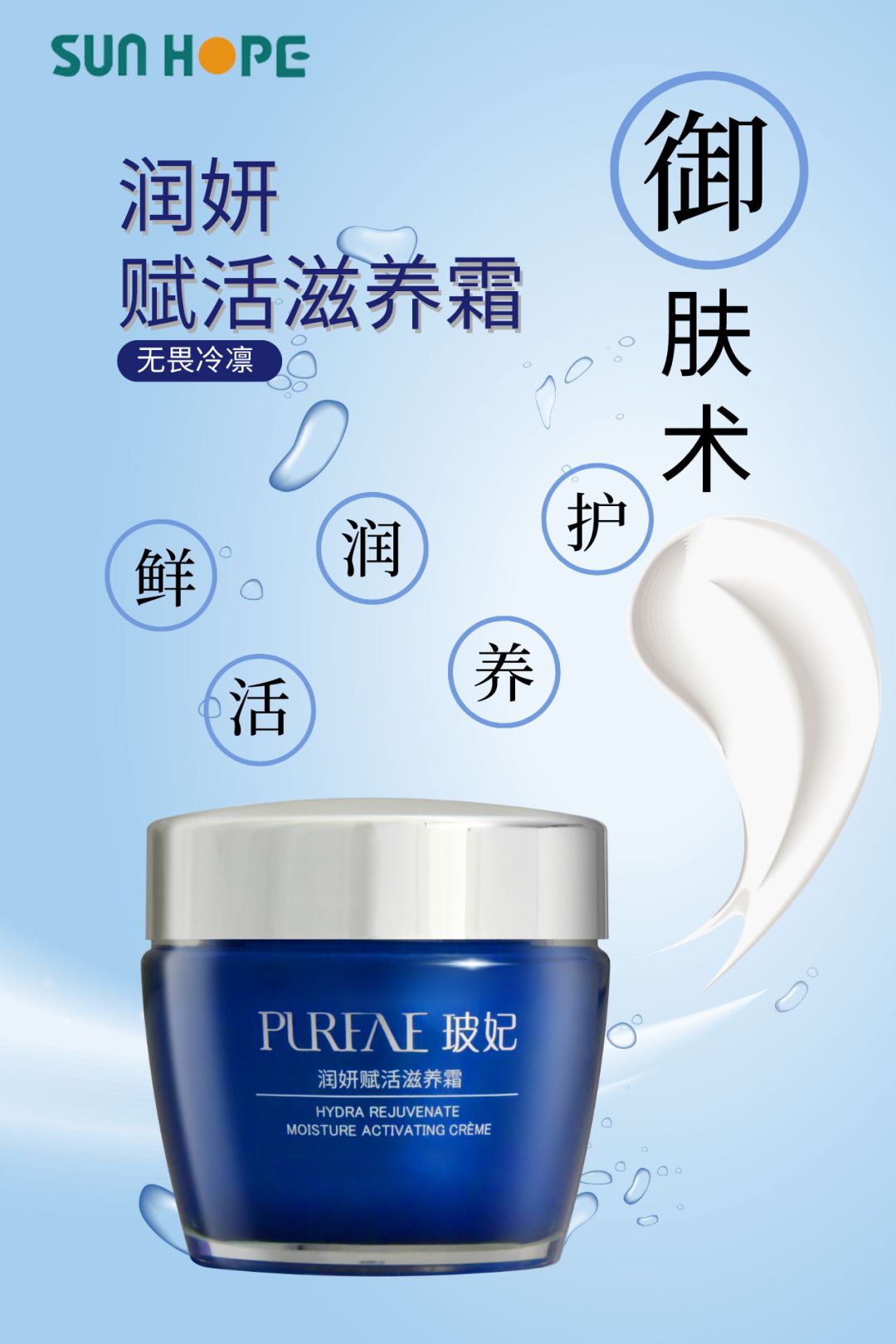 神经酰胺(Ceramide)是以神经酰胺为骨架的一类磷脂,主要有神经酰胺磷酸胆碱和神经酰胺磷酸乙醇胺,角质层中40%~50%的皮脂由神经酰胺构成,神经酰胺是皮肤基质的主要部分,在保持角质层水分的平衡中起着重要作用。神经酰胺具有缔合水分子能力,它通过在角质层中形成网状结构维持皮肤水分。因此,神经酰胺具有保持皮肤水分作用 。 润妍赋活滋养霜 产品简介: 用途:用于干燥季节,保湿、滋润肌肤。 使用方法:每日早晚于菁萃乳后,取适量滋养霜均匀涂抹于面部及颈部,以轻柔推抹方式滑动,直至吸收。 注意事项:外用产品,请勿吞食;如有不适或过敏症状,请立即停止使用;如不慎进入眼睛,请立刻用大量清水冲洗干净,请置于儿童无法拿取之处。 12月5日 即将上市 敬请期待