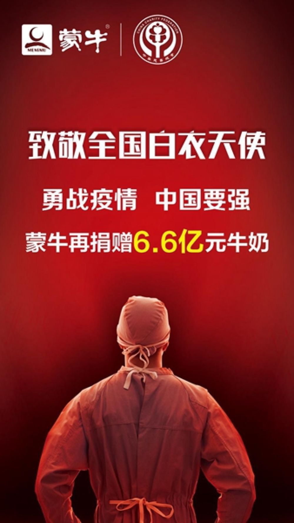 作为一家民族企业,蒙牛责任在肩,此次追加捐赠6.6亿,更彰显了蒙牛集团与全国人民并肩,勇战疫情,共克时艰的决心!保障医务人员、抗击疫情工作者充分的物资供应与营养支持,是做好新型冠状病毒感染的肺炎疫情防控工作中的关键一环和重要保障。蒙牛始终营养全国人民的要强,与全国人民共同守护中国红!为人民群众及食品市场稳定贡献力量!