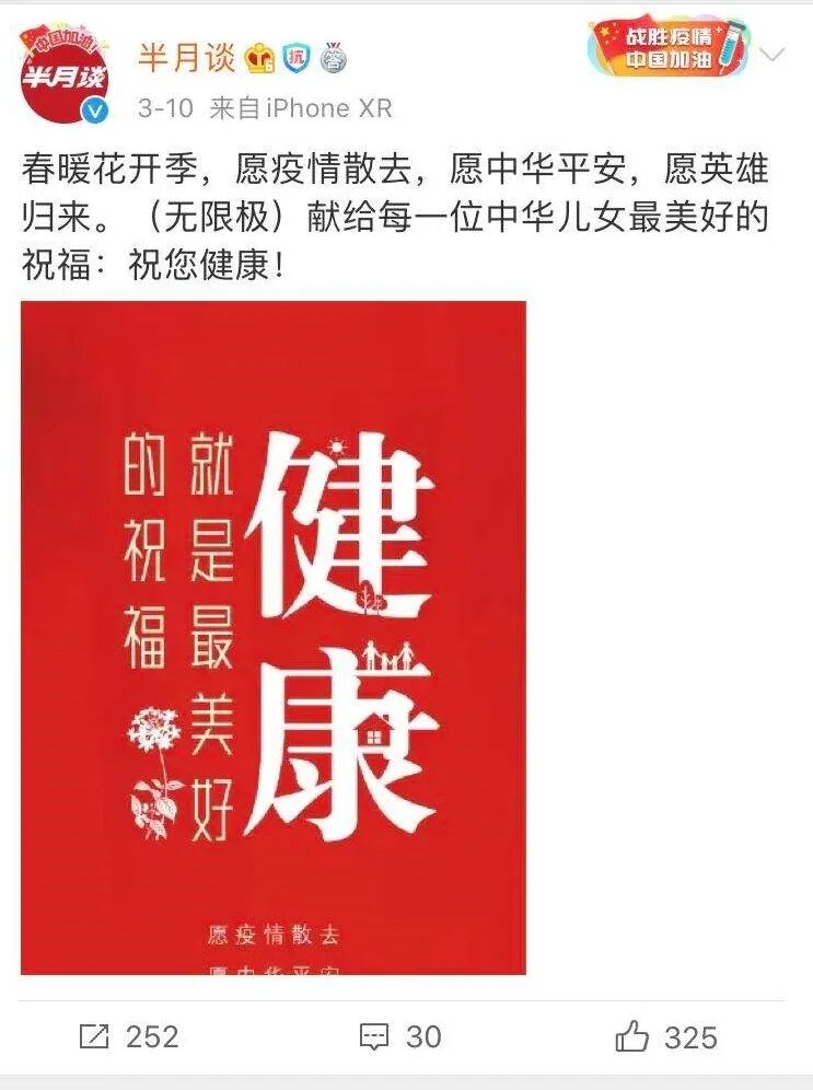 2020年,一场新冠肺炎疫情,让人们重新认识了人生最珍贵的事情,是健康!思想家米歇尔·德·蒙田曾经说过:“缺少了健康,爱情、财富、权势都没有意义。” 近日,新华社民族品牌工程启动了抗疫公益传播行动,支持企业抗击疫情、复工复产,向抗击新冠疫情期间,表现优秀的民族品牌入选企业,提供公益广告服务。 作为新华社民族品牌工程入选企业,无限极希望通过新华社各大媒体的线上、线下渠道,围绕抗疫防控、复工复产等主题,进行公益主题传播,承担企业社会责任,为大家的健康献上一份绵薄之力。同时,向大众传播健康理念,助力健康中国发展。 北京-北京站广场东 (3月9日-3月15日) 北京-王府井百货大楼(3月9日-3月29日) 上海-中国金融信息中心蓝宝石大楼(3月4日-3月31日) 在北京王府井百货大楼、北京站广场东和上海中国金融信息中心蓝宝石大楼,无限极“健康生活·四合理”公益广告已正式上线,希望能够让更多人了解健康理念,践行“四合理”的生活方式,每个人都做好自己健康的第一责任人。 CNC视频客户端-首页信息流(3月12日) 中国金融信息网-首页顶部通栏(3月10日) 中国图片网-热点活动广告位(3月10日) 新华信用-客户端-顶部广告(3月10日) 半月谈网-首页-信息流(3月10日) 半月谈-微博(3月10日) CNC视频客户端、中国金融信息网、中国图片网、新华信用客户端、半月谈网和半月谈微博,发布了无限极“守护健康”的抗疫公益广告,推广健康生活理念,为大众送上健康祝福。 接下来,无限极还将继续携手新华社以及各大权威媒体平台,向社会公众传播健康理念,一起助力,打赢抗疫狙击战!让我们一起守护健康,共同期待春暖花开的那一天!