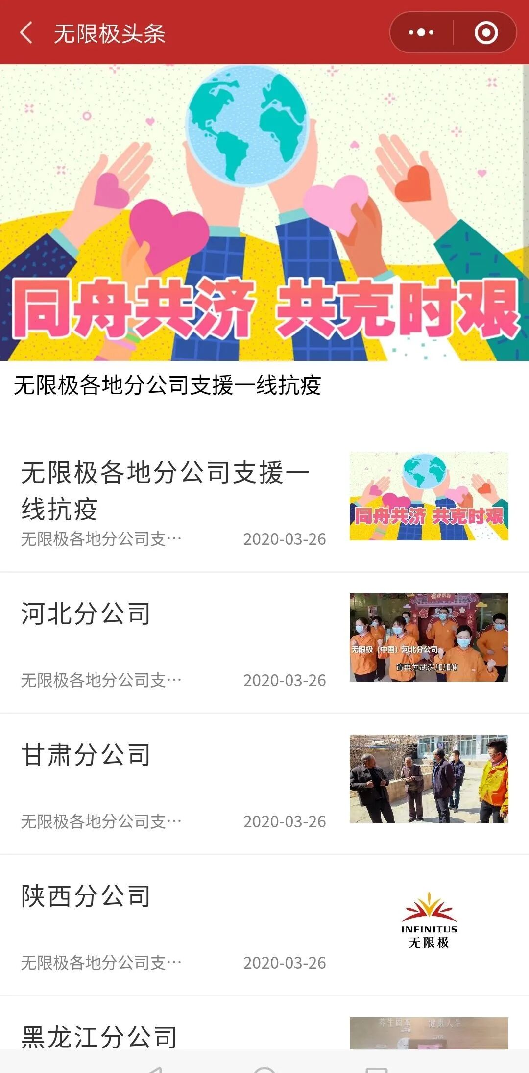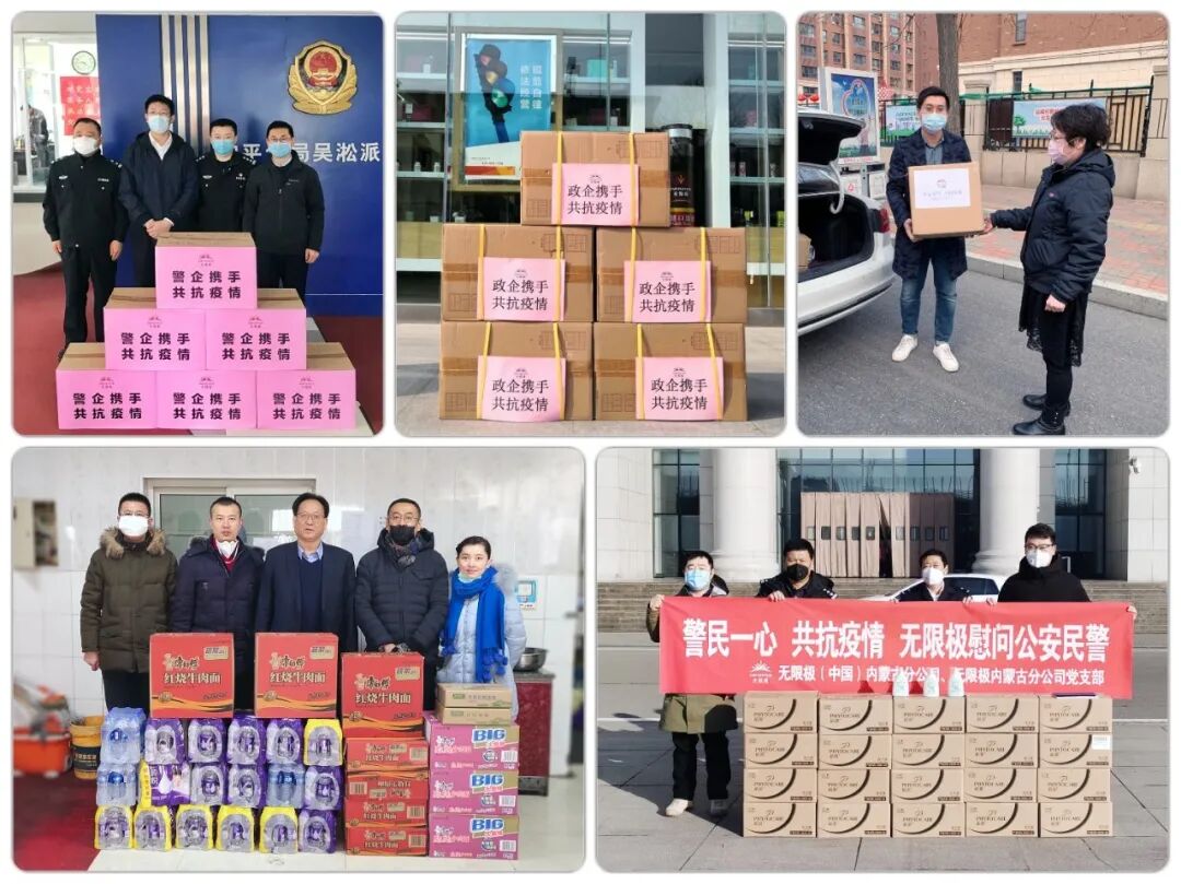 新疆、山西、江西、重庆、辽宁、江苏、安徽、内蒙古、河南分公司积极响应当地防控疫情号召,组织、协调多方资源,捐赠了一次性手套、口罩、洗手液和酒精等抗疫物资,支援奋战在抗疫一线的工作人员。北京、陕西、黑龙江、湖南、宁夏、吉林、青海、云南、海南、浙江、山东、天津、广东和贵州分公司除了捐赠抗疫物资外,还携手当地监管一线工作人员,举办了多场线上培训活动,向专卖店主和业务伙伴宣导防疫复工注意事项和消费者权益保护知识,倡议伙伴们规范经营,保障自身和消费者的健康与安全。在疫情爆发初期,无限极就积极行动,第一时间成立新型冠状病毒疫情防控小组,及时调整各项生产经营安排;定向捐赠500万元人民币给湖北武汉疫区;响应南方医科大学求援需求,捐赠包括洗手液、空气净化器等总价100万的物资。国内疫情逐步得到控制后,公司响应政府号召,在确保业务伙伴和员工健康和安全的前提下,通过线上办公、为专卖店免费提供“复工防疫包”等措施,尽最大限度复工复产,以实际行动支援抗疫行动。经历过多次重大自然灾害和疫情侵袭的中国,每次都凭借强大的民族凝聚力安然度过。无限极坚信,有全国人民众志成城的抗疫故事,我们一定能同舟共济、共克难关,取得这次抗击疫情的最终胜利!