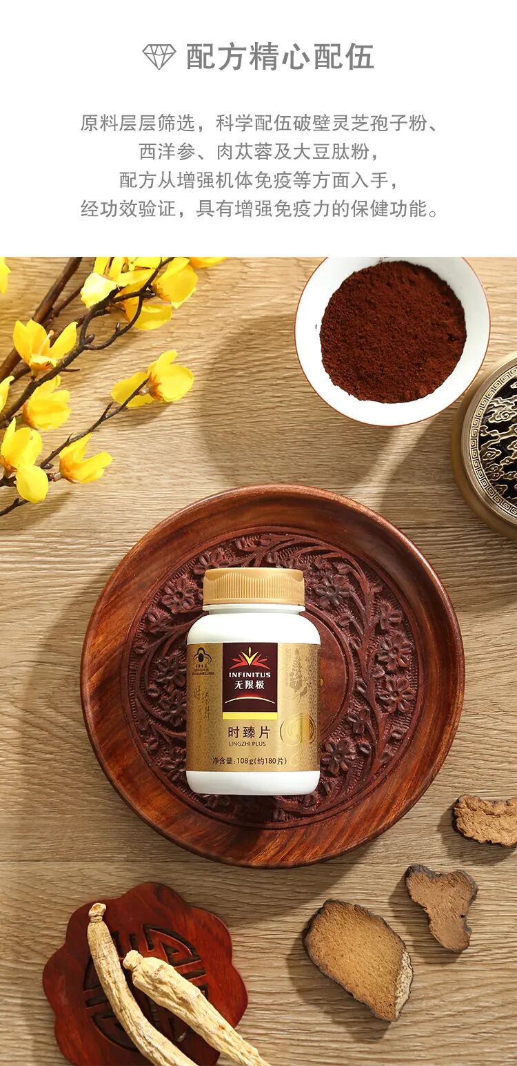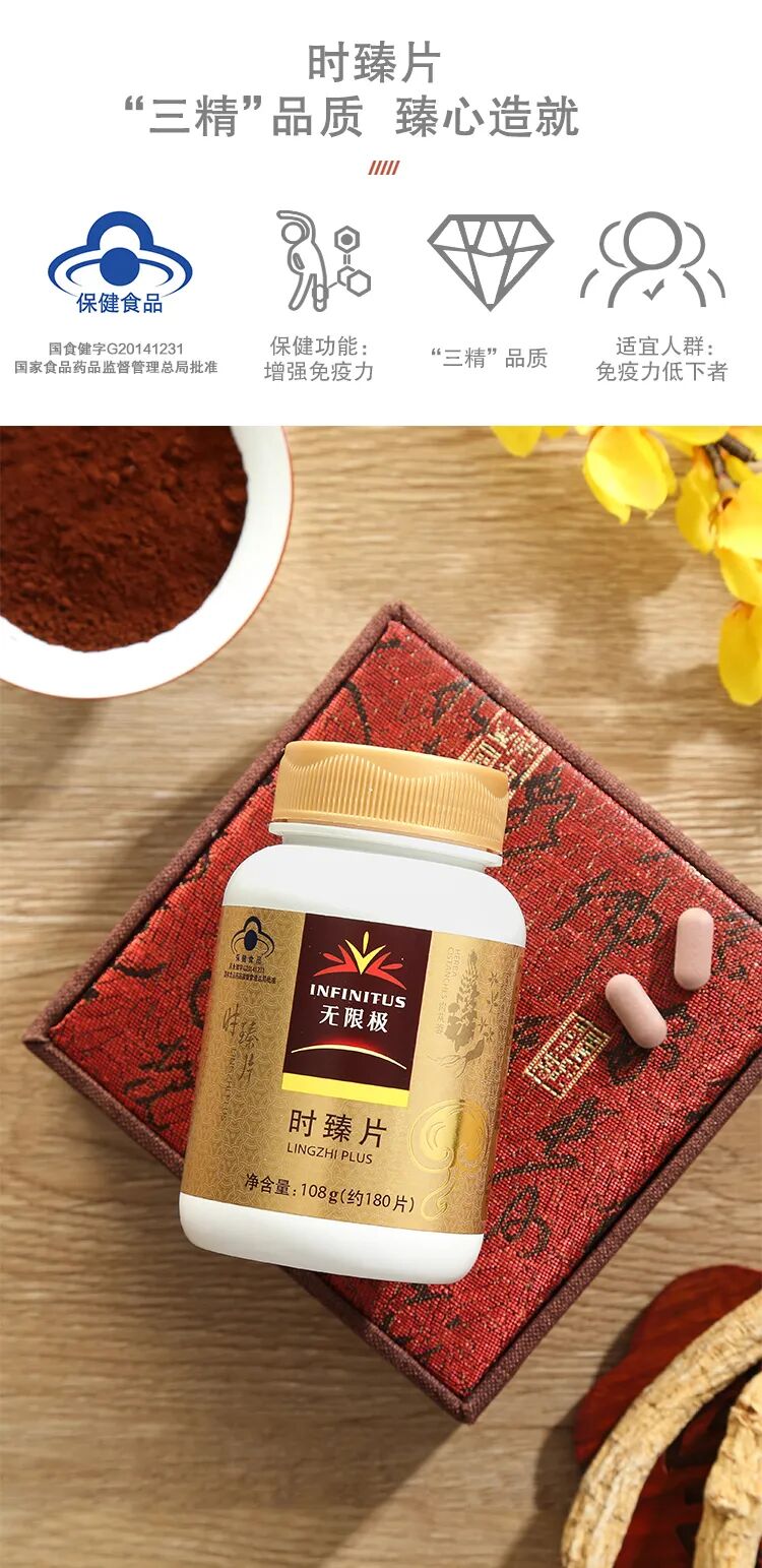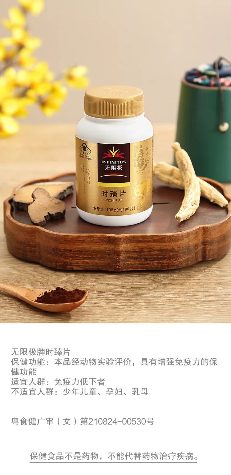 无限极牌时臻片,是以破壁灵芝孢子粉、西洋参、肉苁蓉、大豆肽粉等为主要原料制成的保健食品,经动物实验评价,具有增强免疫力的保健功能。