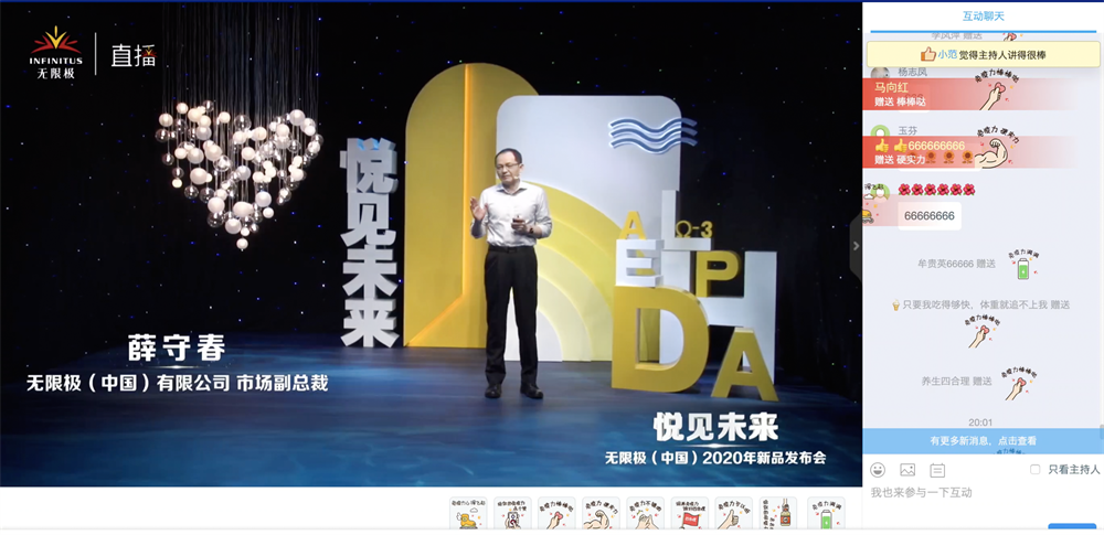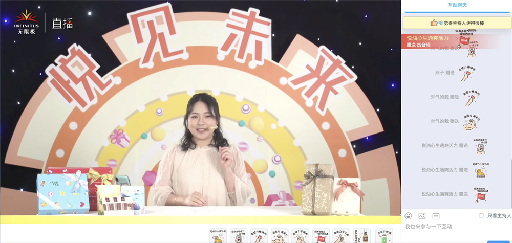 公司市场副总裁薛守春先生 公司市场副总裁薛守春先生作为新品发布会主讲人,发布了5款新产品,并向观看视频直播的广大消费者和业务伙伴讲述了无限极牌悦通凝胶糖果的研发故事。 介绍悦通凝胶糖果时,薛守春先生表示:“国民健康意识在不断加强,健康消费需求正加速升级,人们不仅要求产品有益处,也要植物来源、颜值高、口感佳等,同时还要适合年轻人。在新形势下,公司推出无限极牌悦通凝胶糖果。” 薛守春先生还为大家介绍了悦通凝胶糖果的三大亮点:植物来源,创新配方;4A组合,含量丰富;技术升级,品质保障。 中国农业科学院油料作物研究所研究员许继取博士 近年来,无限极一直致力于功能油脂领域的研究,并取得相关研究成果。悦通凝胶糖果便应用了功能油脂领域研究的部分技术成果。 中国农业科学院油料作物研究所研究员许继取博士来到了直播间,为大家揭开了“油”的奥秘。他说:“现在大量的科学研究已经证明,正确补充油脂可以调节生命活动,保护我们的健康。希望大家为了自己和家人的健康,能够正确吃油,少吃油、吃好油,吃出美味、吃出健康。” 数据洞察专家、中国信息协会市场研究业分会副会长张弛先生 在发布会上,数据洞察专家、中国信息协会市场研究业分会副会长张弛先生分享了“全民健康新观念加速形成”“个人健康意识强化”“年轻族群健康消费趋势”“新零售加速”“线上线下融合成为新常态”等五大消费趋势。他告诉大家说:“每个变化都蕴含机会,我们越是积极地面对它,拥抱变化,就越是能让自己抓住积极的一面。” 顺应新的健康消费趋势,无限极推出了又一款增强免疫力的产品——无限极牌慧蓓口服液。薛守春先生为大家讲解了它的三大亮点:科学配方,功效保障;臻选产地,精选原料;领先工艺,苛守品质。 无限极还推出了三款适合3岁及以上少年儿童日常洗护使用的产品——植雅儿童洗护系列,包含洗发露、沐浴露、润肤乳。 薛守春先生与工作人员现场试用了植雅儿童洗护系列润肤乳,分享了产品的使用感受。 在发布会的第二现场,直播小助手通过抽奖的方式,为观众们送上了多种多样的礼物,大家纷纷送上“火箭”和“鲜花”,在评论里直呼“666”! 以线上视频直播的方式举行新品发布会,是公司在数字化升级的一次创新尝试,无限极希望能让更多消费者和社会大众及时了解5款新产品,为人们的生活添彩,为大家的健康加油。