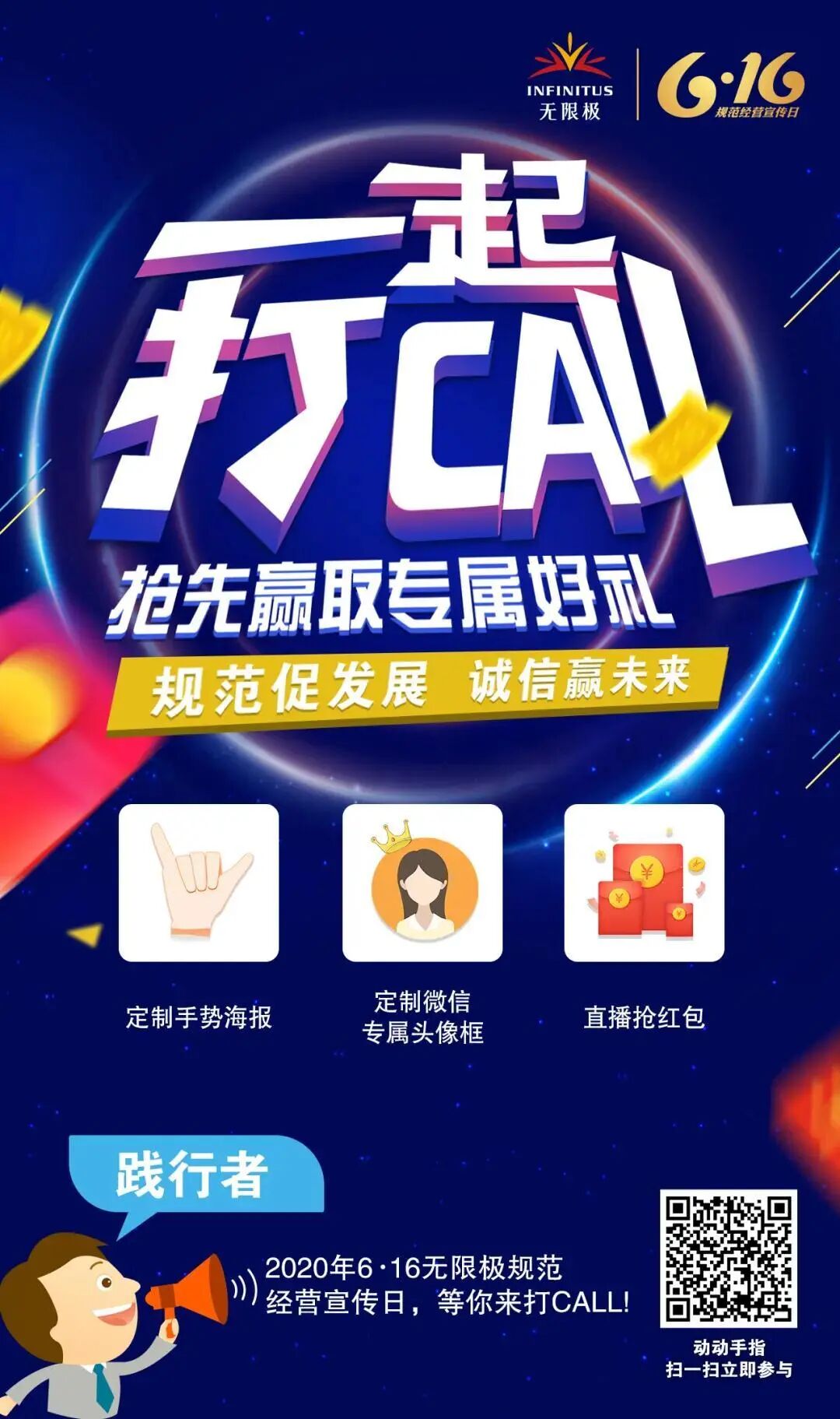 2020年 “无限极规范经营宣传日” 已迈入第四个年头 我们期待有更多人与我们一起 诚信经营,团结互助 营造和谐共赢的市场环境 在此,我们邀请你一起 用“手势”为规范发声 以自己的承诺和行动 传递责任和担当 共建良好经营环境