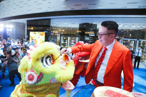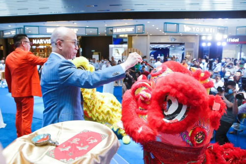 在全场的掌声和欢呼声中,绿叶科技集团创始人、董事长,玛维莎国际时装有限公司创始人、董事长徐建成击鼓传令、开启传统舞狮送福,并邀请绿叶科技集团董事、总裁,玛维莎国际时装有限公司董事李仙霖共同登台为瑞狮点睛,号令两只雄狮激情欢腾、呈祥纳瑞,为开业庆典送来美好的寓意与祝福。