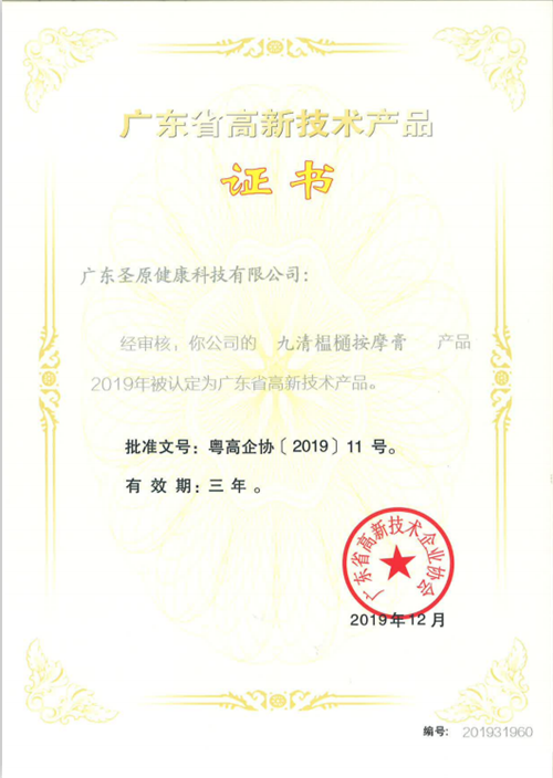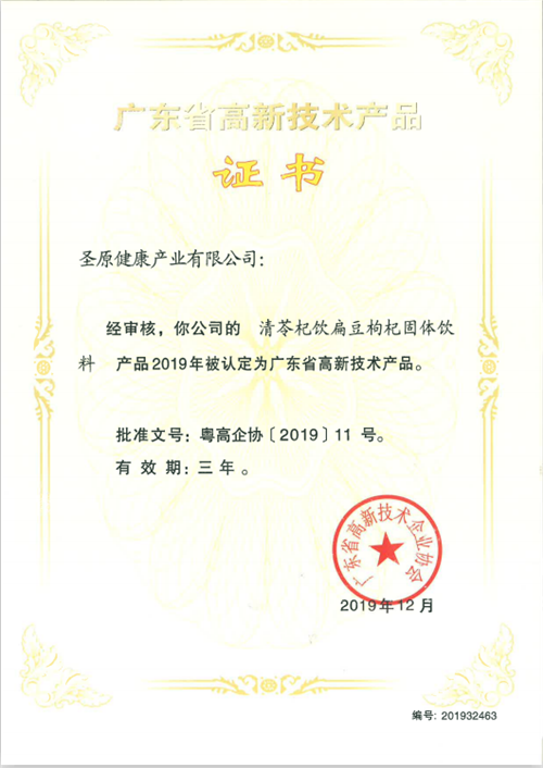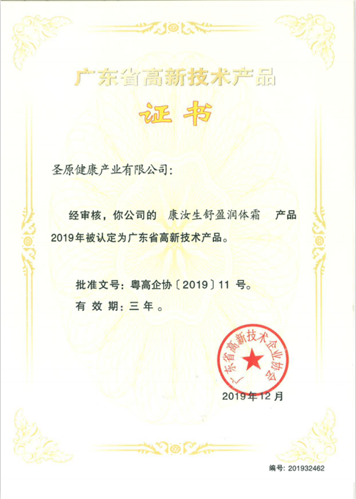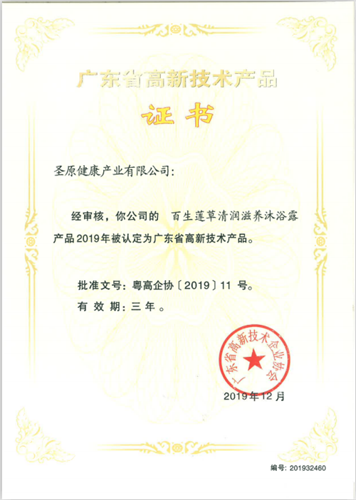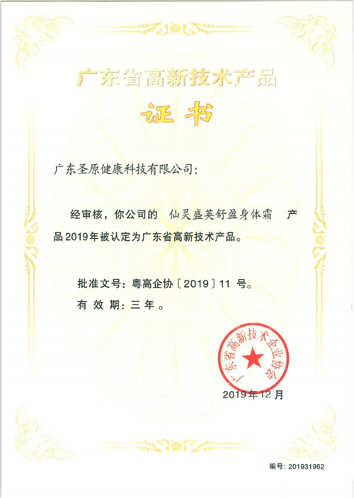 继丁苓益生茯苓黄精固体饮料、荞果金莱菔子山楂固体饮料、通桂舒元清润护肤霜、甘林清梓滋润舒体霜、柏叶鲜芝养润洗发露、欣柑保倍润霜荣获“广东省高新技术产品”认定之后,圣原产品再获认可,迄今为止,圣原共有15款产品获得此项认定。