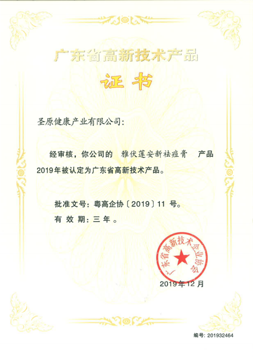 近日,广东高新技术企业协会发布了《关于公布广东省2019年通过认定高新技术产品名单的通知》,圣原出品的9款产品(雅伏莲安新祛痘膏、清苓杞饮扁豆枸杞固体饮料、康汝生舒盈润体霜、伏研净清怡舒体霜、百生莲草清润滋养沐浴露、龙桂芪欣舒畅身体霜、仙灵盛英舒盈身体霜、仙蓉温齐滋养按摩膏、九清榅樋按摩膏)荣获“广东省高新技术产品”认定。