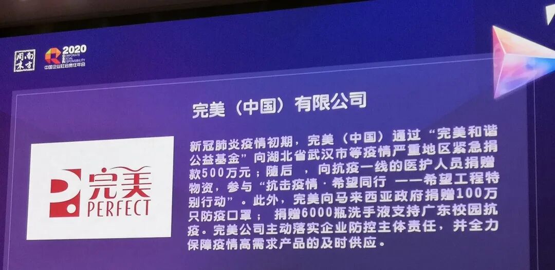 作为最早响应支持抗击疫情的企业之一,完美公司在1月26日紧急捐款500万元驰援武汉等疫情严重地区。随后,完美公司又参与了“抗击疫情·希望同行——希望工程关爱抗疫一线医务人员子女特别行动、关爱因疫致困青少年特别行动”,致敬抗疫英雄 ,关爱英雄子女。