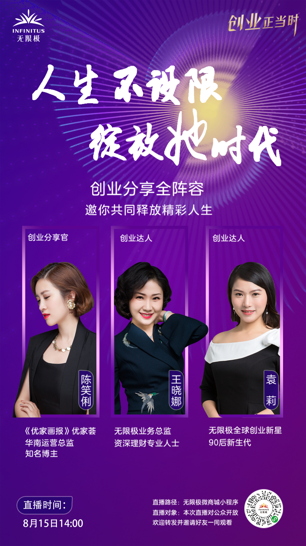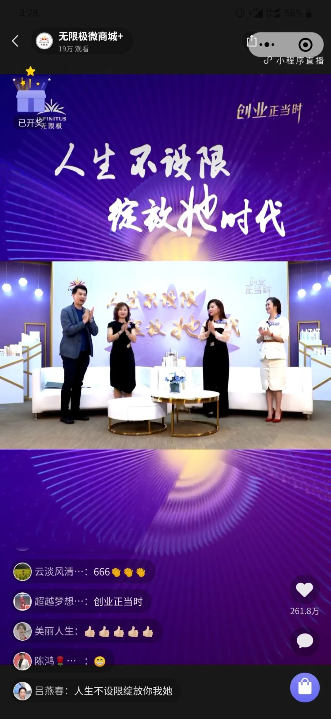 8月15日,通过无限极微商城小程序,公司举办了《人生不设限 绽放她时代——创业正当时》直播。直播观看人次达到19.5万,点赞数达到281万。 知名博主陈笑俐女士,无限极业务总监、资深理财专业人士王晓娜女士,无限极全球创业新星90后新生代袁莉女士,三位创业达人在直播中为大家分享了女性创业背后鲜为人知的故事,和大家一起探讨了女性创业的魅力与优势。