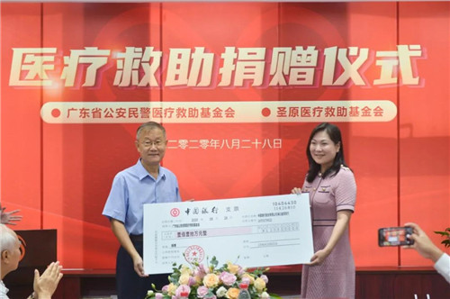 8月28日上午,圣原健康产业有限公司向广东省公安民警医疗救助基金会捐赠仪式在圣原公司正式举行。广东省见义勇为基金会理事长、省公安民警医疗救助基金会顾问朱明健,广东省公安民警医疗救助基金会理事长杨成崑,圣原健康产业有限公司总裁徐若菲、副总裁余志坤等领导出席了捐赠仪式。
