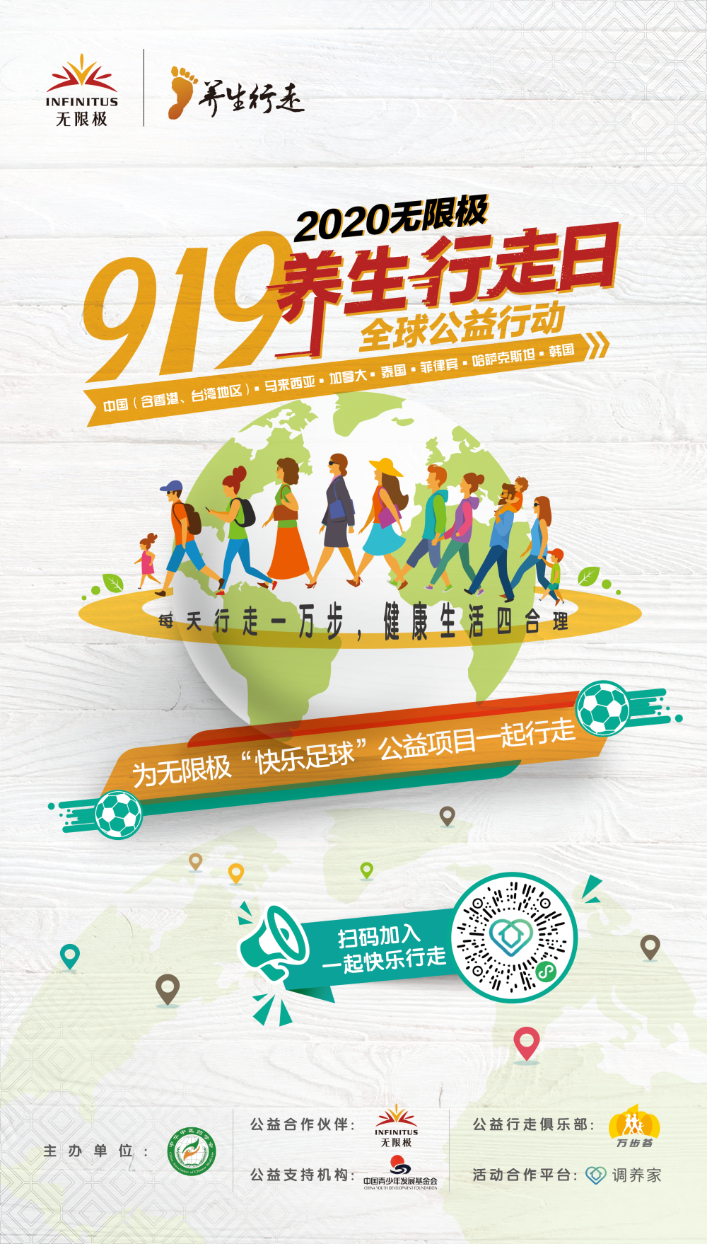 而在众多日常健身运动中,公认最便利、最经济、最老少皆宜的,无疑就是行走。金秋9月,为了推动行走养生的普及,推广健康的生活方式,提升全民健康素质,由中华中医药学会联合无限极发起的“919养生行走日”来了!