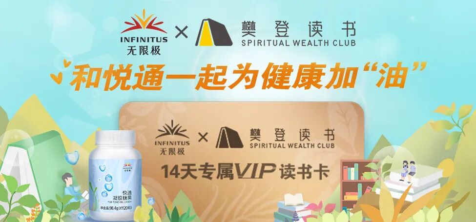 为此,一直倡导“养生固本,健康人生”、“健康生活四合理”的无限极,不仅不断研发高品质健康产品满足消费需求,近日更跨界合作樊登读书,推出定制VIP读书卡,帮助消费者养成健康生活好习惯,助力消费者从“健康的身体”到“有趣的灵魂”全面提升。