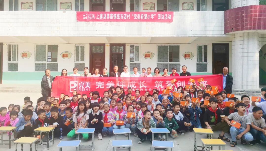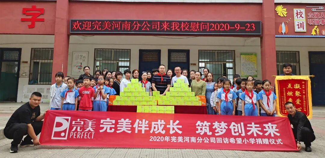 “完美有大爱,慈善遍中原”。多年来,完美河南分公司矢志不渝地履行社会责任,开展社会公益事业的范围涉及希望小学、老区建设、无偿献血、母亲水窖、慈善救灾等领域。在河南省委宣传部、省委老促会的大力支持下,完美河南分公司在驻马店市上蔡县韩寨乡、濮阳市范县张庄乡捐建了两所希望小学,受到河南省委、省政府的特别嘉奖,荣获“支持老区建设贡献奖”。完美公司成立至今,不忘初心,坚持与爱同行,未来,将继续支持公益事业,贡献完美力量。