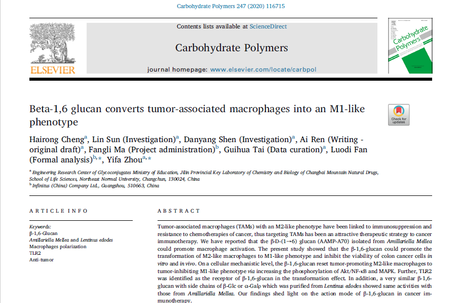 这一突破性研究结果为食用真菌及其多糖的开发应用提供了理论基础。成果以《Beta-1,6 glucan converts tumor-associated macrophages into an M1-like phenotype》(《β-1,6葡聚糖可将肿瘤相关巨噬细胞转化为M1表型》)为题,发表在国际糖类研究权威杂志《Carbohydrate Polymers》上。