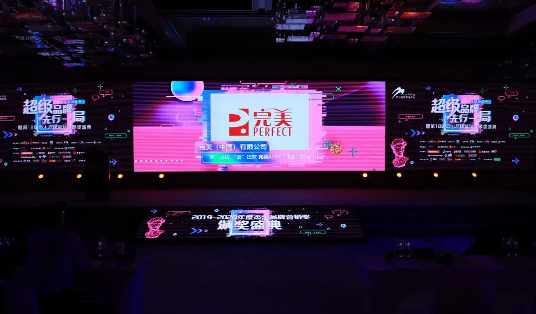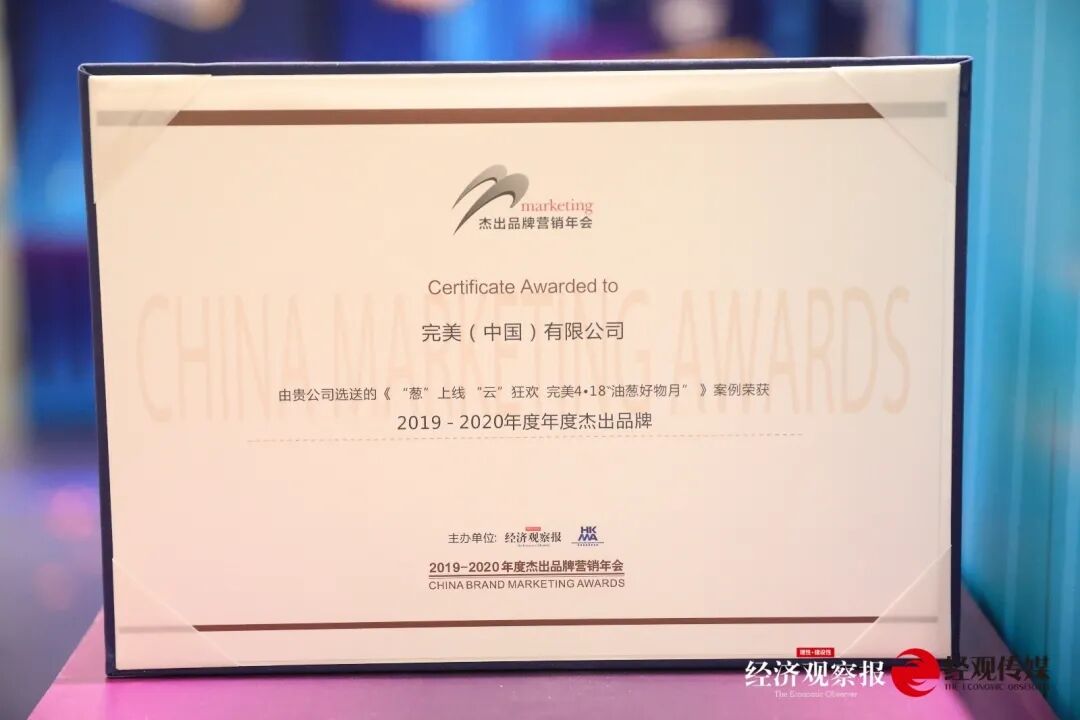 “理想生活消费节”是经观传媒多年打造的‘杰出品牌营销年会’的升级版。本届消费节汇聚了中国营销界权威的理论和实战专家,并将商业社会行业精英汇聚一堂。提供了一个高质量的展示、交流和学习的平台。 今年的杰出营销奖,评选出了案例奖、单项奖、产品奖、人物奖等各类奖项。杰出品牌营销年会已成功举办17届。以当年营销案例征集为出发点,研究中国营销形态,褒奖优秀的企业及助推行业发展突出表现的人,打造“全商业,全营销,全整合,全分享”平台。 ▲活动现场 第18届杰出品牌营销奖颁奖典礼上,完美(中国)有限公司(简称“完美公司”)的《“葱”上线,“云”狂欢,完美4•18“油葱好物月”》案例凭借“出圈”的品牌影响力,荣获“2019-2020年度杰出品牌营销奖”——年度杰出品牌。