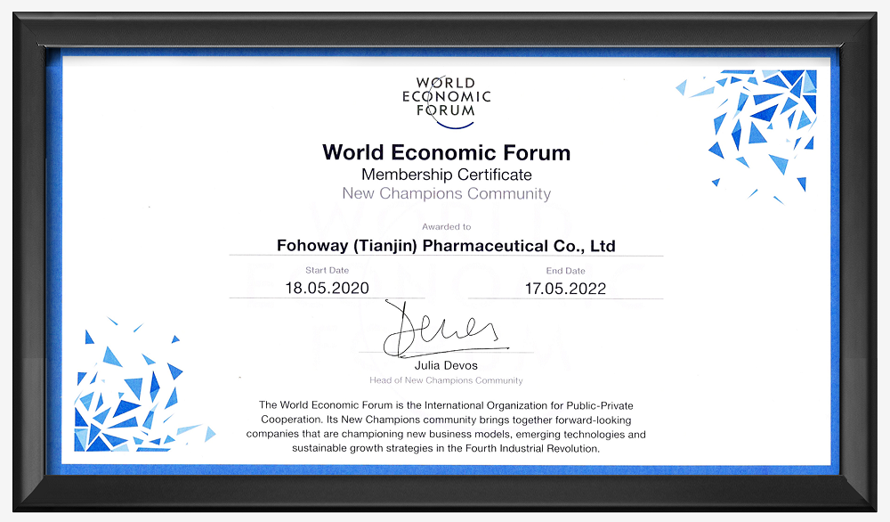 2020 年 11 月 17 日,位于北京环球金融中心的世界经济论坛北京代表处召开了主题为“大重构时代下的新领军企业”的世界经济论坛创新先锋论坛。达沃斯世界经济论坛会员企业天津和治友德制药有限公司应主办方的邀请,企业代表董事长韩金明先生、天津和治友德科技发展有限公司董事副总裁李凡先生作为嘉宾应邀出席本次活动。鉴于和治友德全球的行业影响力和贡献,天津和治友德制药有限公司被授予“世界经济论坛新领军企业”证书。