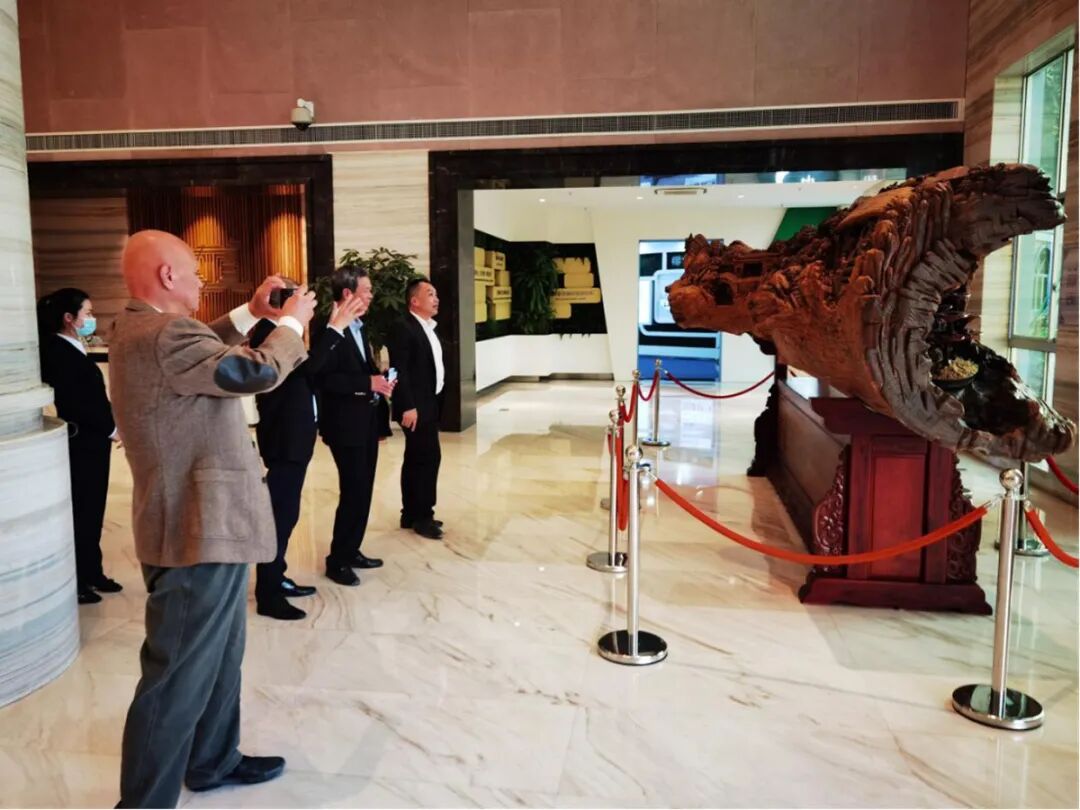 在安发大厦一层大厅,参观铭刻“安发十二故事”的乌木后拍照留念