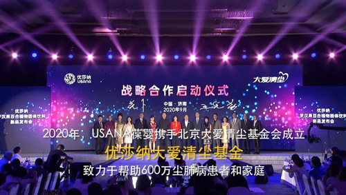 2020年9月,在优莎纳罗汉果百合植物固体饮料上市之际,USANA葆婴携手大爱清尘,成立优莎纳大爱清尘公益基金,共同救助绝望中的尘肺病同胞。