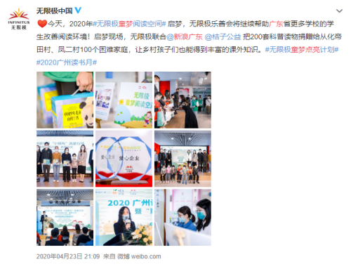 2020年4月23日,藉第25个“世界读书日”之际,乐善会携手新浪广东发起“无限极童梦点亮计划”,将阅读的话题延伸到了社交媒体平台,微博话题阅读量达到496.9万人次。活动中,乐善会为100个困难家庭配捐了共200套科普读物,并获评新浪广东“2020年广东年度公益行动奖”。