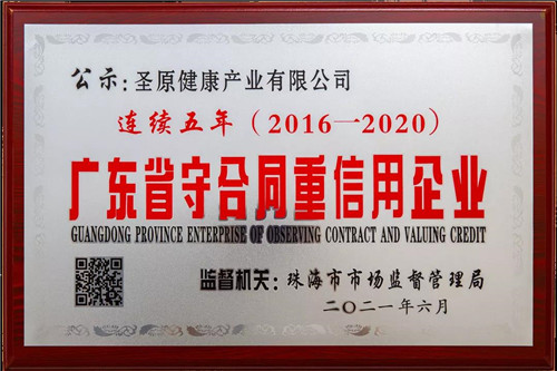 近日,2020年度广东省“守合同重信用”企业公示名单揭晓,凭借着诚信守法的良好信誉、严谨规范的合同管理体系以及良好的经营效益,圣原健康产业有限公司(以下简称“圣原”)和广东圣原健康科技有限公司顺利通过广东省工商行政管理局的最终评审,第五次荣获“广东省守合同重信用企业”荣誉称号。