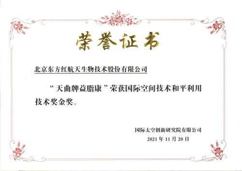 2021年11月18日~20日,“2021空间技术和平利用(健康)国际研讨会”以线上形式在北京召开。天曲牌益脂康荣获“国际空间技术和平利用技术奖金奖”。