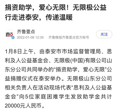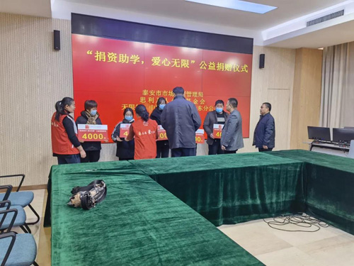 1月8日上午,由泰安市市场监督管理局、思利及人公益基金会、无限极(中国)有限公司山东分公司共同举办的“捐资助学,爱心无限”公益捐赠仪式在泰安举办。无限极山东分公司相关负责人在活动现场代表“思利及人公益基金会”向5位家庭困难学生发放助学金共计20000元人民币。