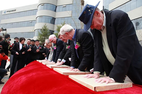 在生物谷诺贝尔广场双螺旋雕塑前,诺奖大师与珍奥双迪领导共同为“核酸发现150周年暨DNA修复细胞机制获诺贝尔奖3周年庆典”揭幕。