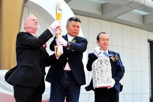 大会主席陈玉松先生,诺贝尔化学奖得主哈特穆特·米歇尔博士和百奥泰集团梅晓丹博士,拾级而上,来到圣火采集处。陈玉松先生首先将火炬点燃,与米歇尔博士双手高举火炬示意,寓意生命之火生生不息。